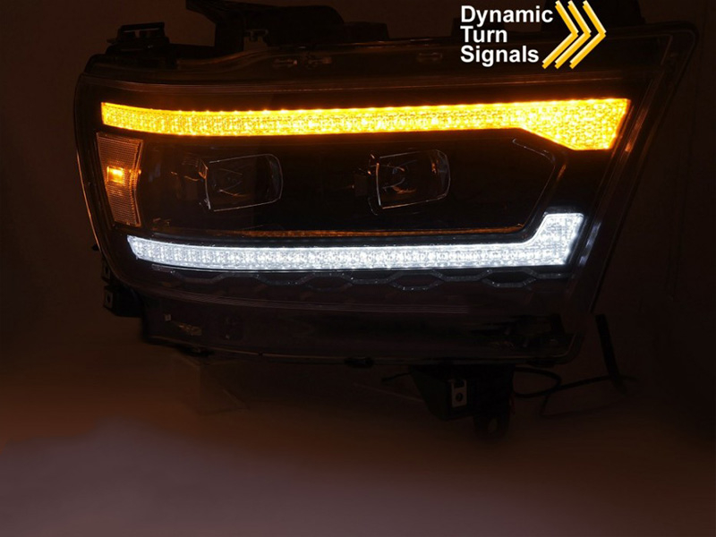 Комплет LED тунинг фарови за Dodge Ram 1500 2019-2022 со црна основа, со динамични жмигавци, за моделот со фабрични DRL светла, со функција "welcome", лев и десен